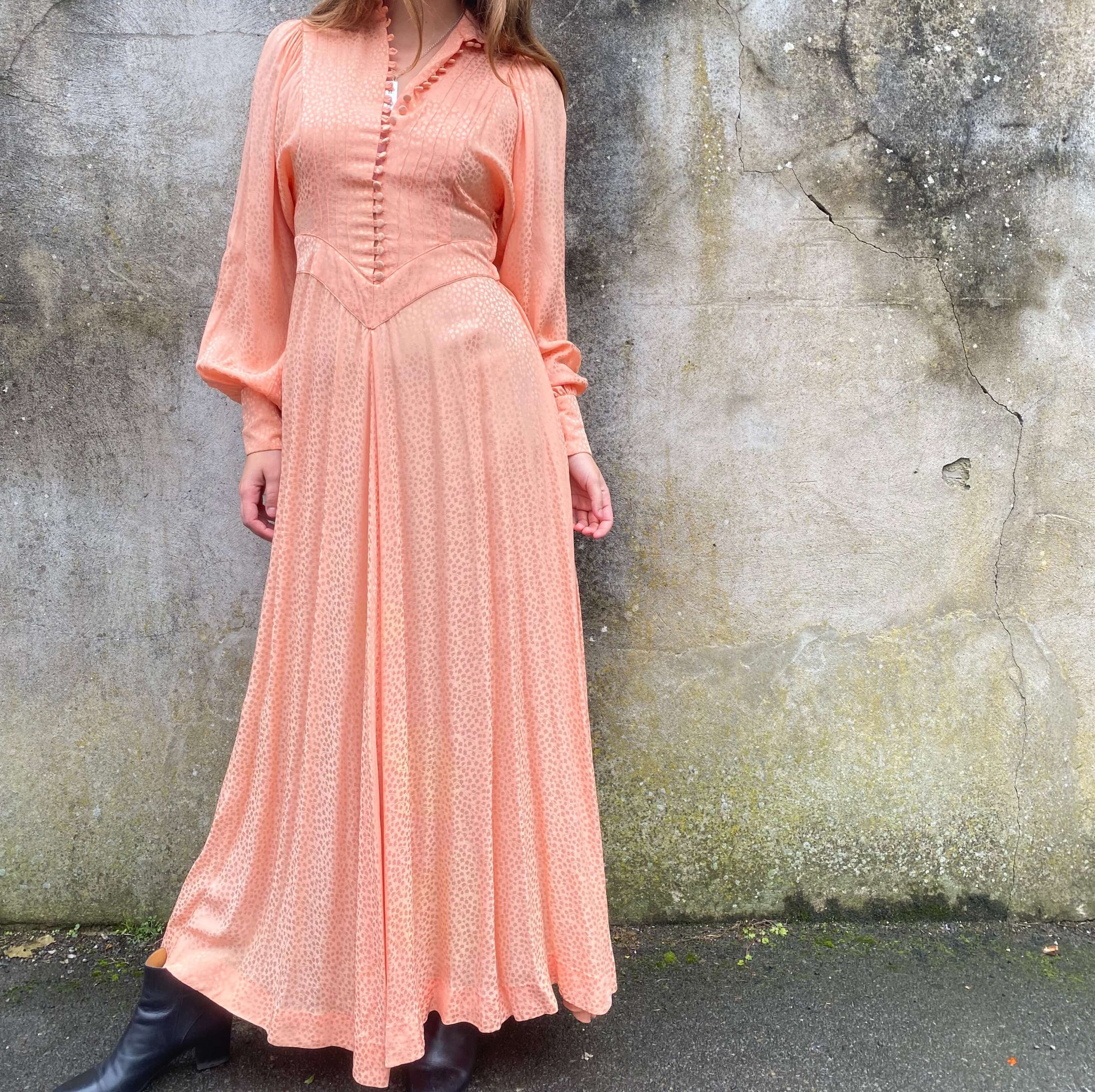 This gown beautifully bridges the gap between the romantic elegance of the 1930s and the bold spirit of the 1970s. It’s perfect for vintage enthusiasts who appreciate the timeless charm of historical fashion but want to make a modern statement. The combination of intricate detailing and a flattering silhouette ensures that this gown will remain a cherished piece in your wardrobe for years to come.