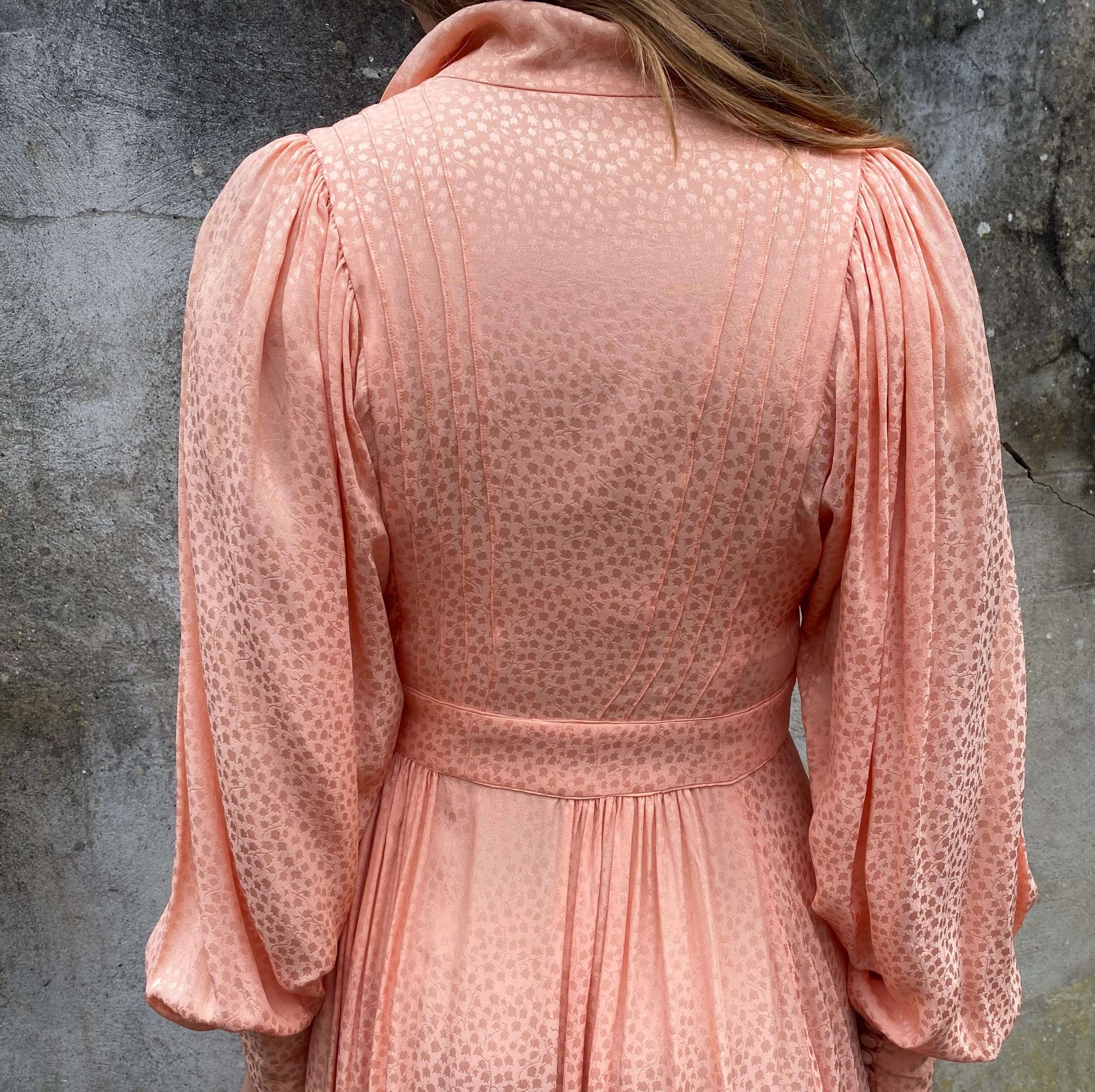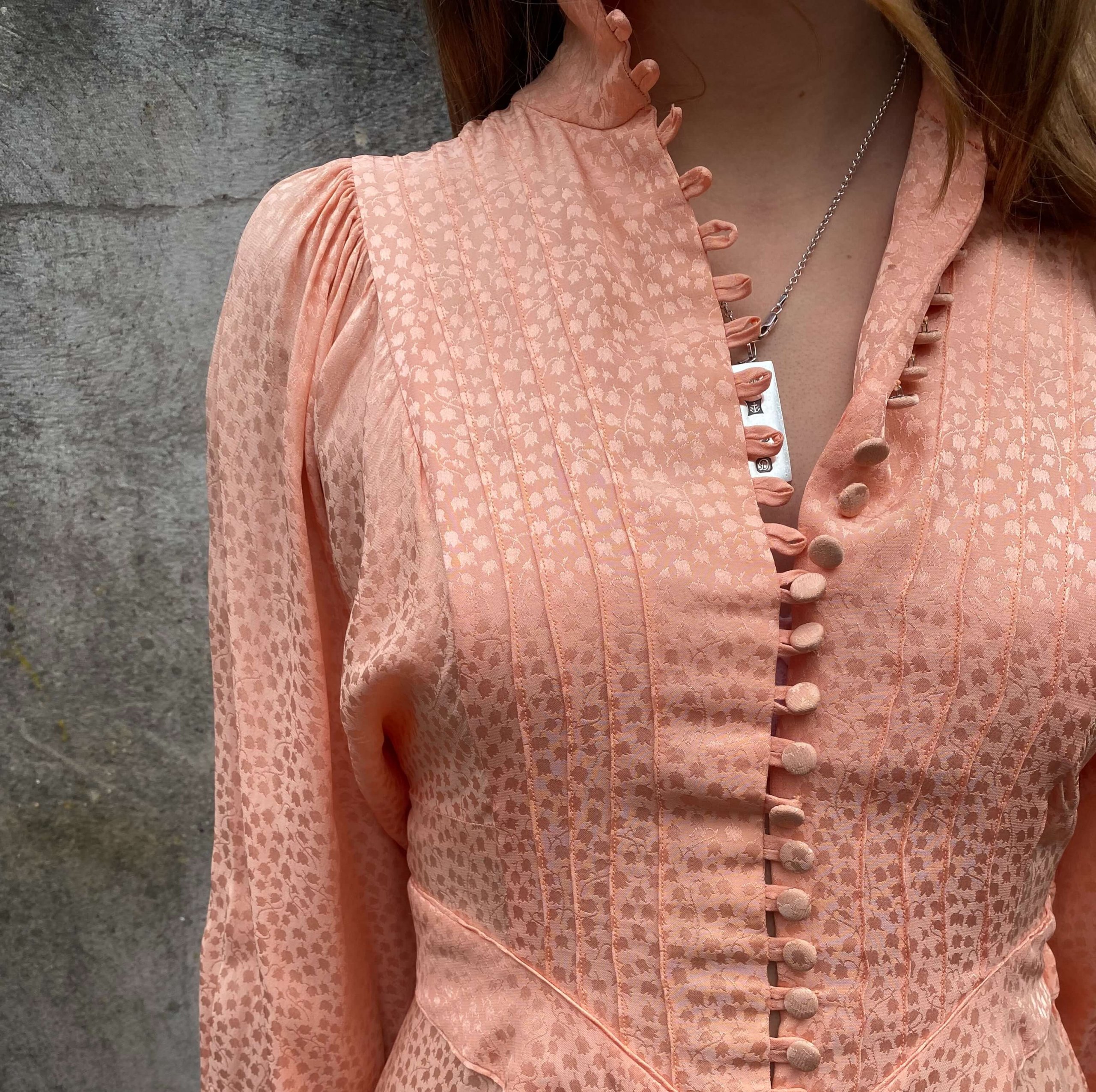 Experience the enchanting blend of eras with this Jacquard 1970s Does 1930s Button Down Gown. This exquisite piece combines the luxurious fabric and intricate designs reminiscent of the 1930s with the bold silhouette and playful spirit of the 1970s. Perfect for those who appreciate vintage fashion, this gown is a stunning testament to the elegance of both decades.