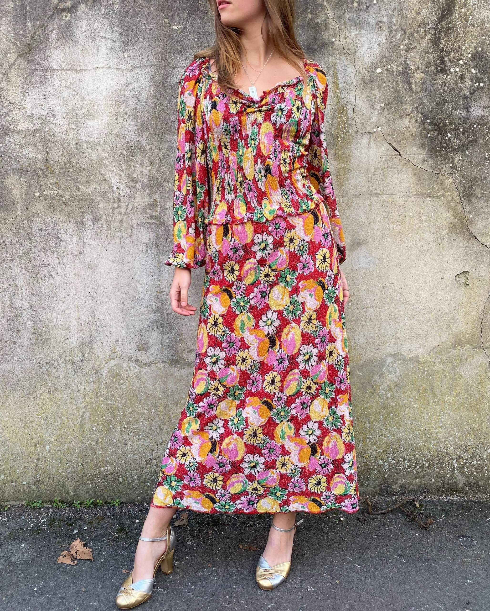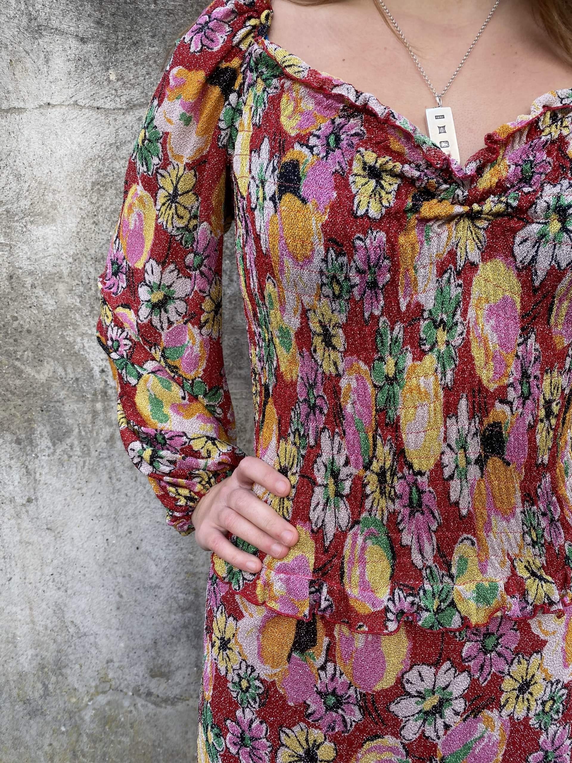 Step into 1970s bohemian elegance with this captivating Lurex Floral Maxi Dress. Crafted from lightweight fabric with shimmering lurex threads woven throughout, it features a vibrant floral print that radiates retro charm. Perfect for festivals, garden parties, or glamorous evenings, this dress embodies the free-spirited glamour of the era with a hint of sparkle.