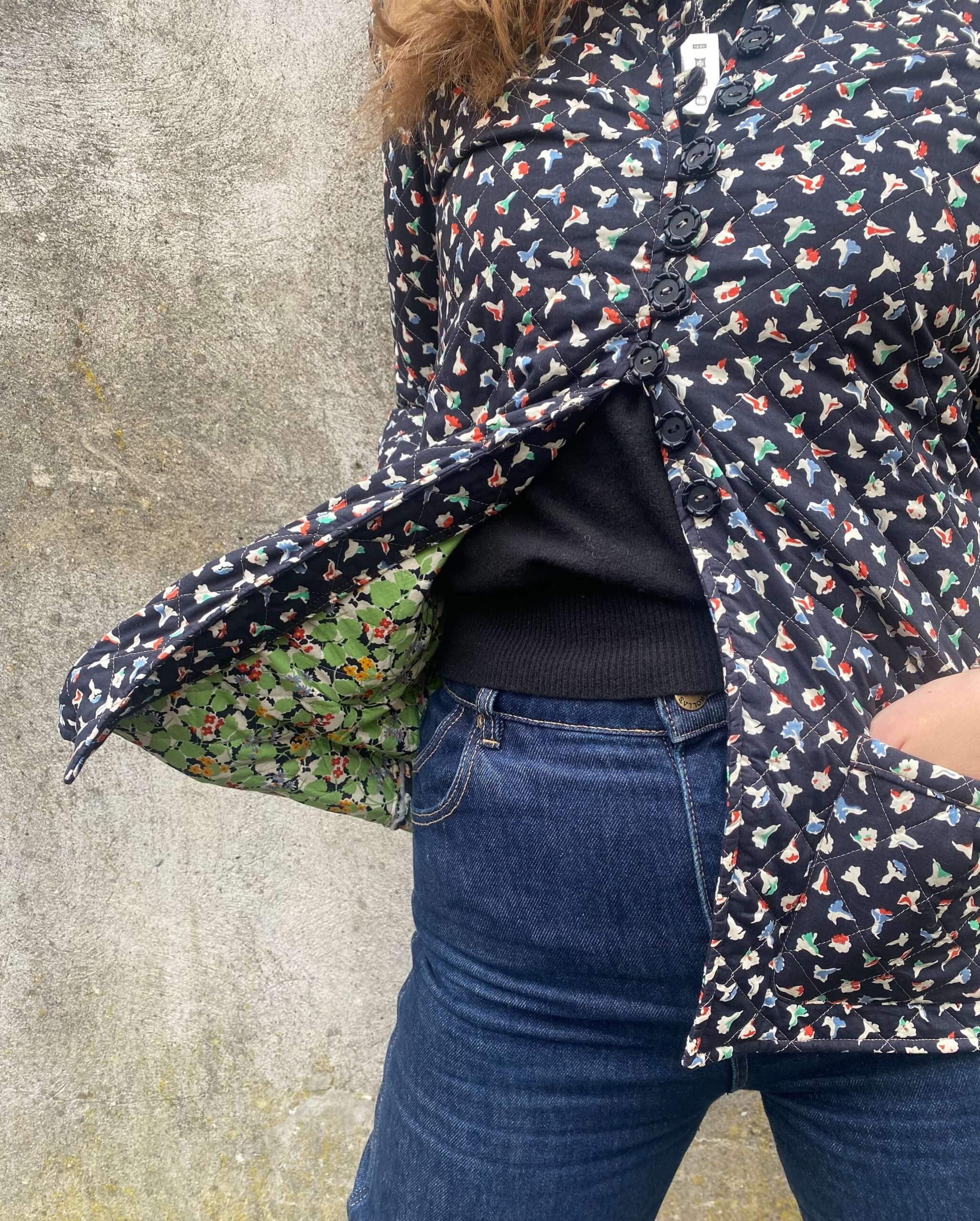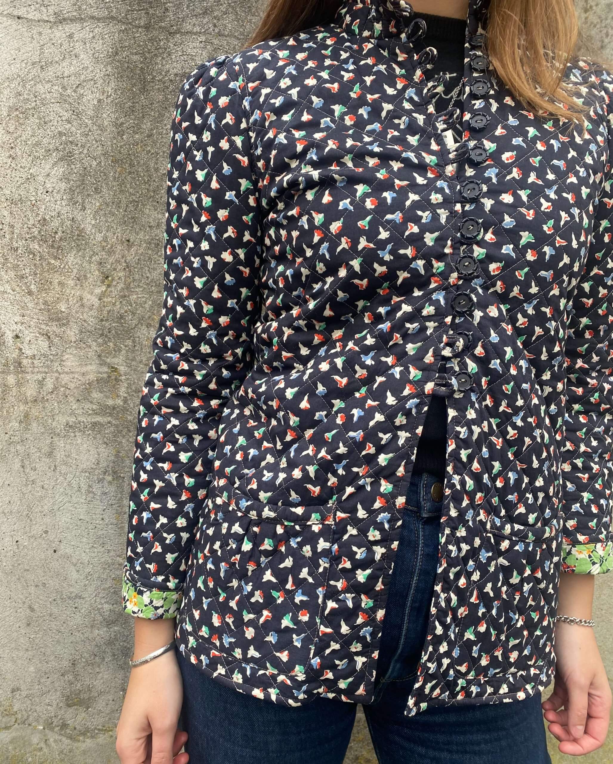 Step back in time and embrace the understated luxury of the 1970s with this stunning Julie Phipps Quilted Jacket, made from the finest Liberty London fabric. This exquisite piece combines rich history with timeless style, perfect for those who appreciate classic craftsmanship and attention to detail. The dark tone of the jacket, punctuated by a delicate floral pattern, brings a sense of quiet sophistication, while the luxurious quilted texture adds a layer of warmth and refinement to this vintage treasure.