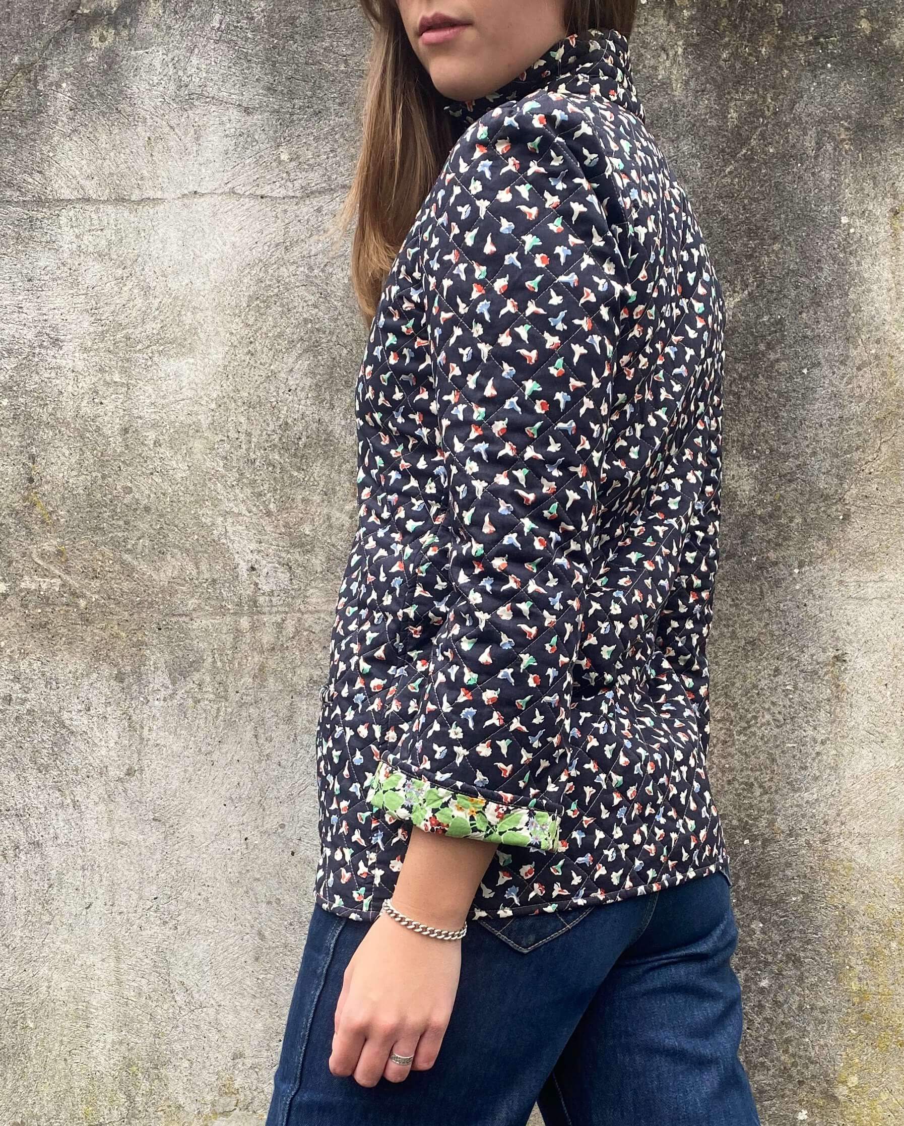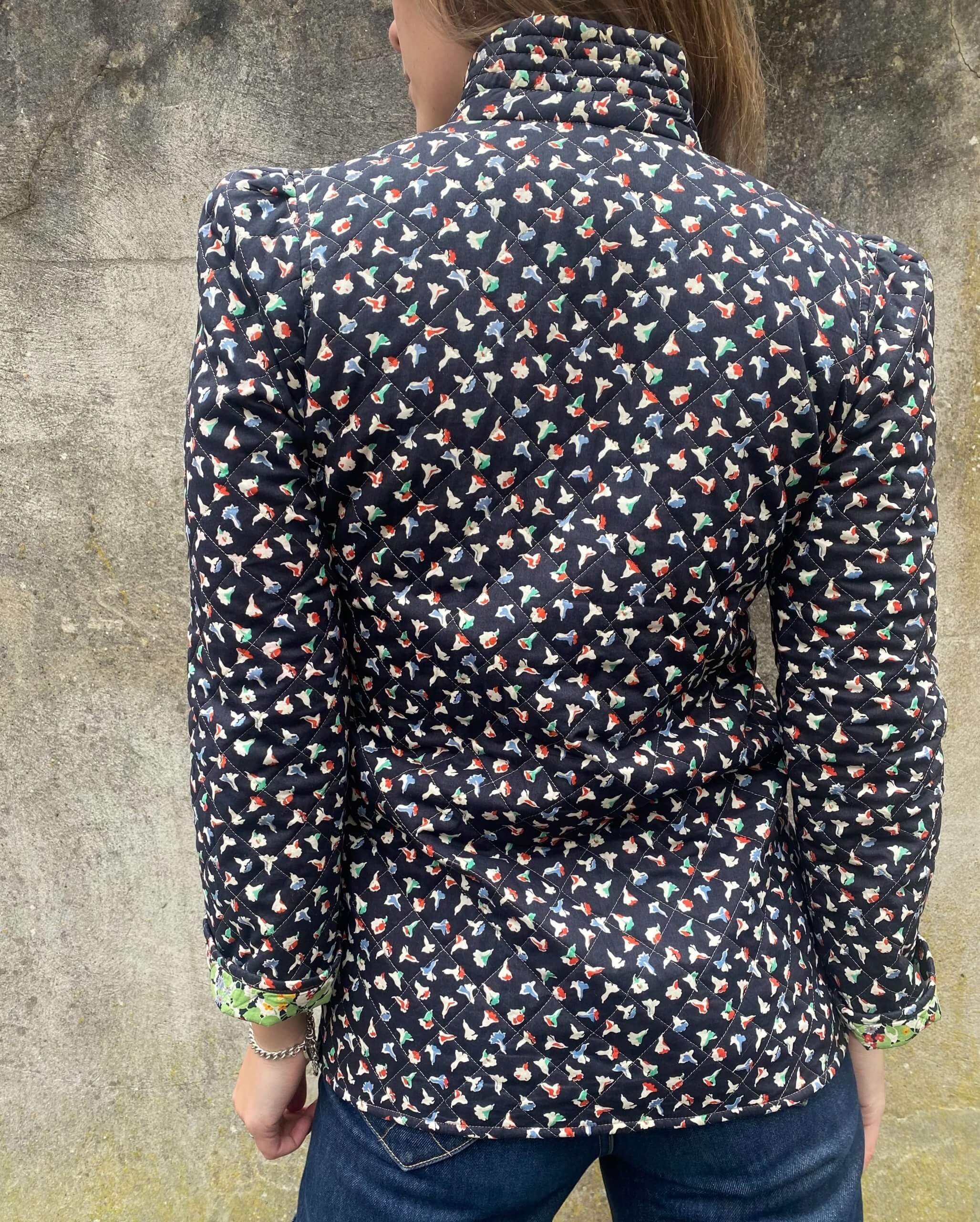 The jacket is made from premium Liberty London fabric, known for its intricate floral designs and high-quality finish. The small, delicate floral pattern in muted tones gives the piece a timeless, feminine charm, perfect for adding an elegant touch to any outfit.