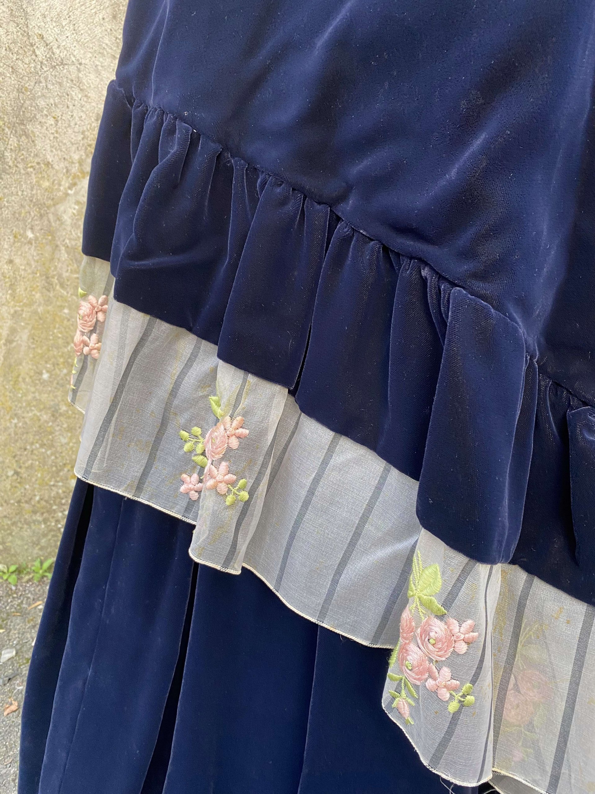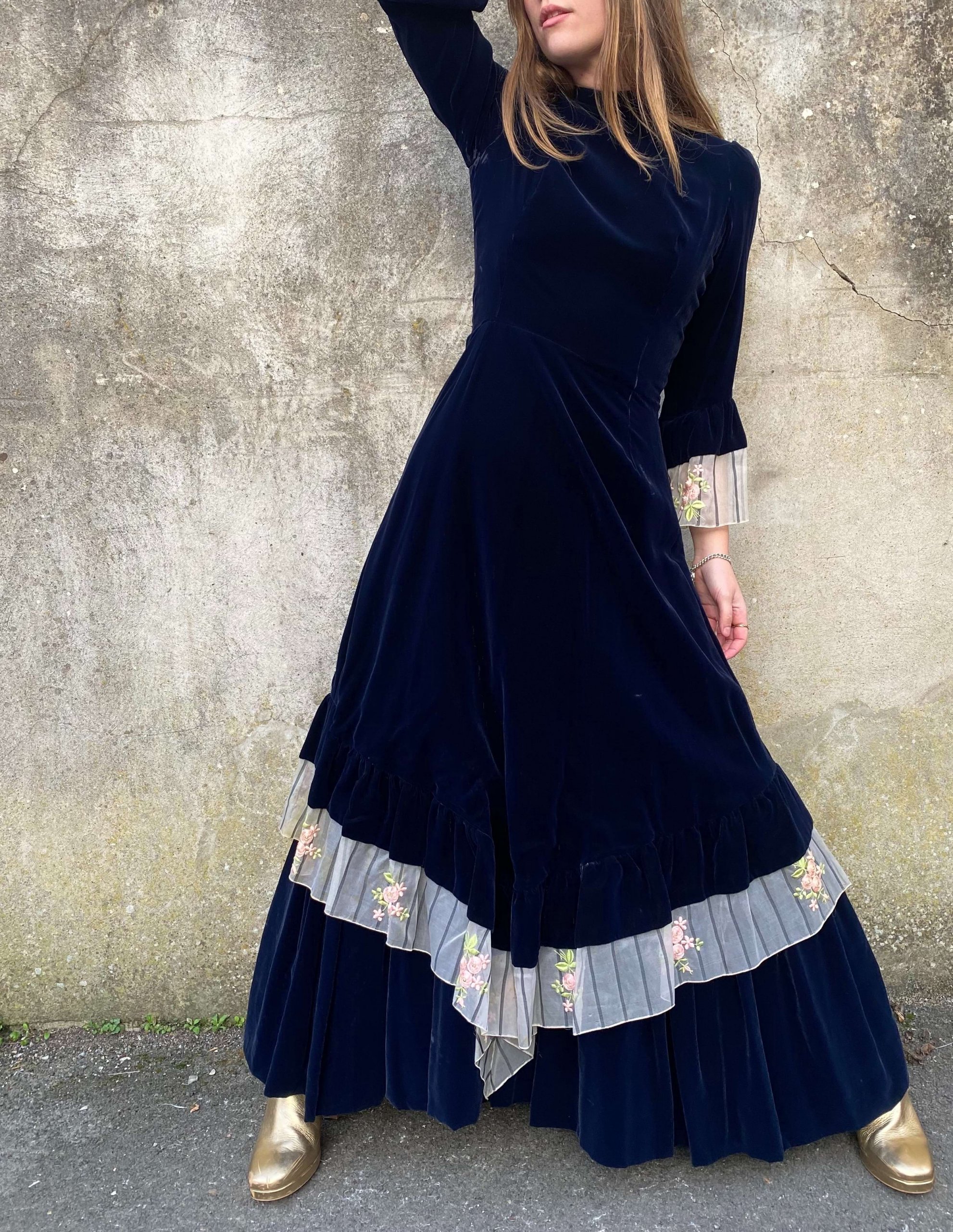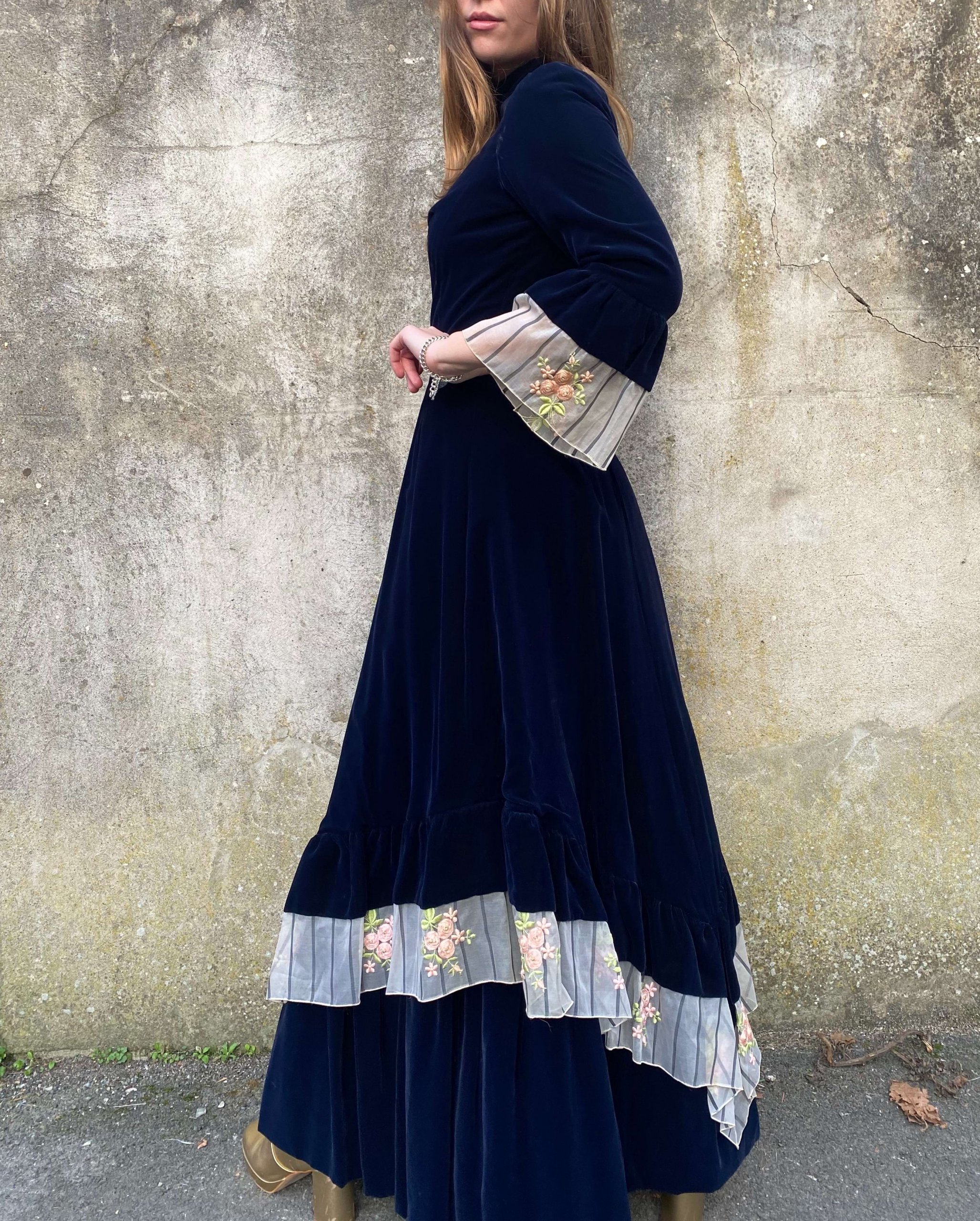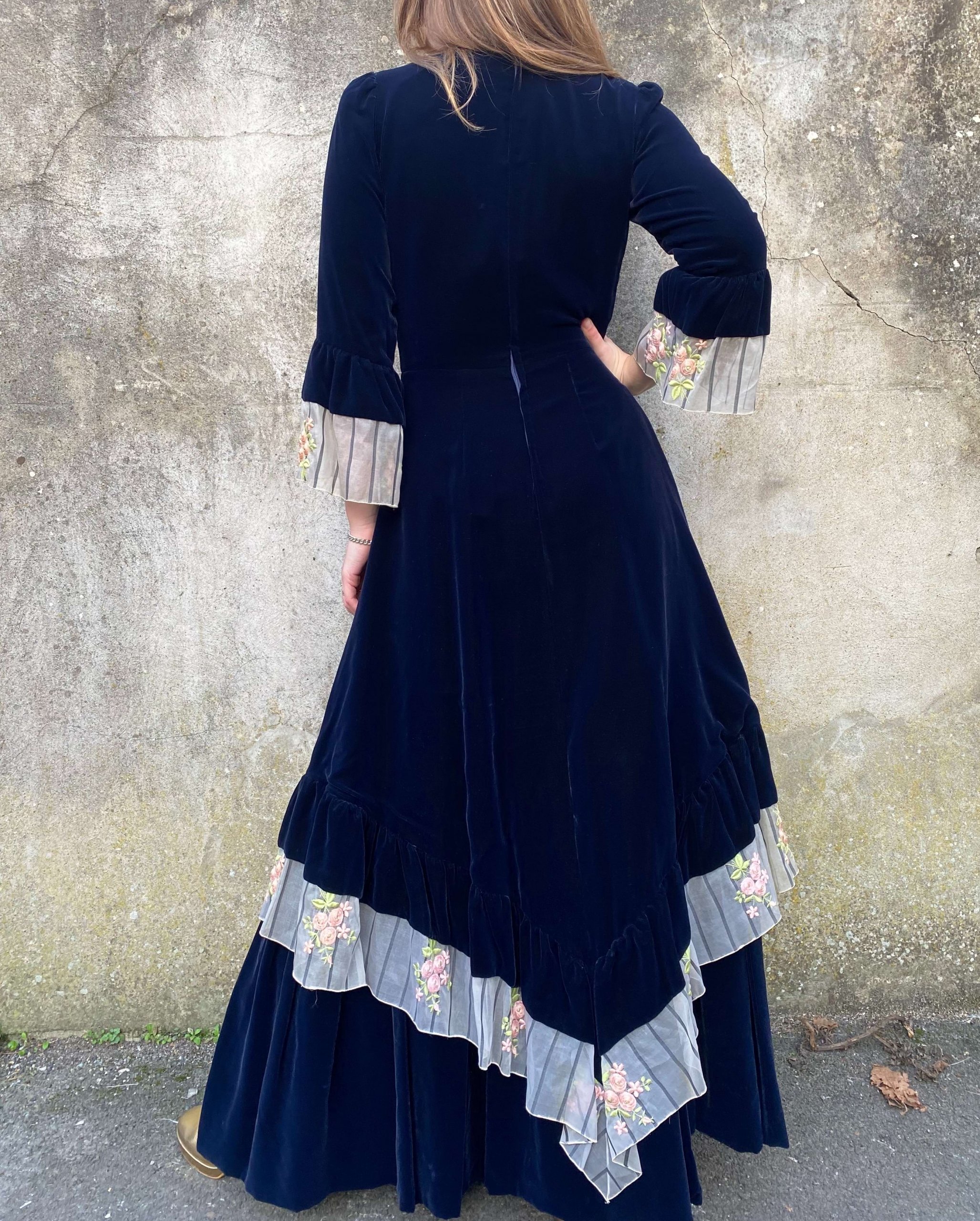Made from plush navy velvet, this dress exudes luxury and elegance. The deep, rich hue enhances the velvety texture, providing a sophisticated backdrop that complements the intricate floral embroidery and captures the essence of 1970s bohemian fashion.