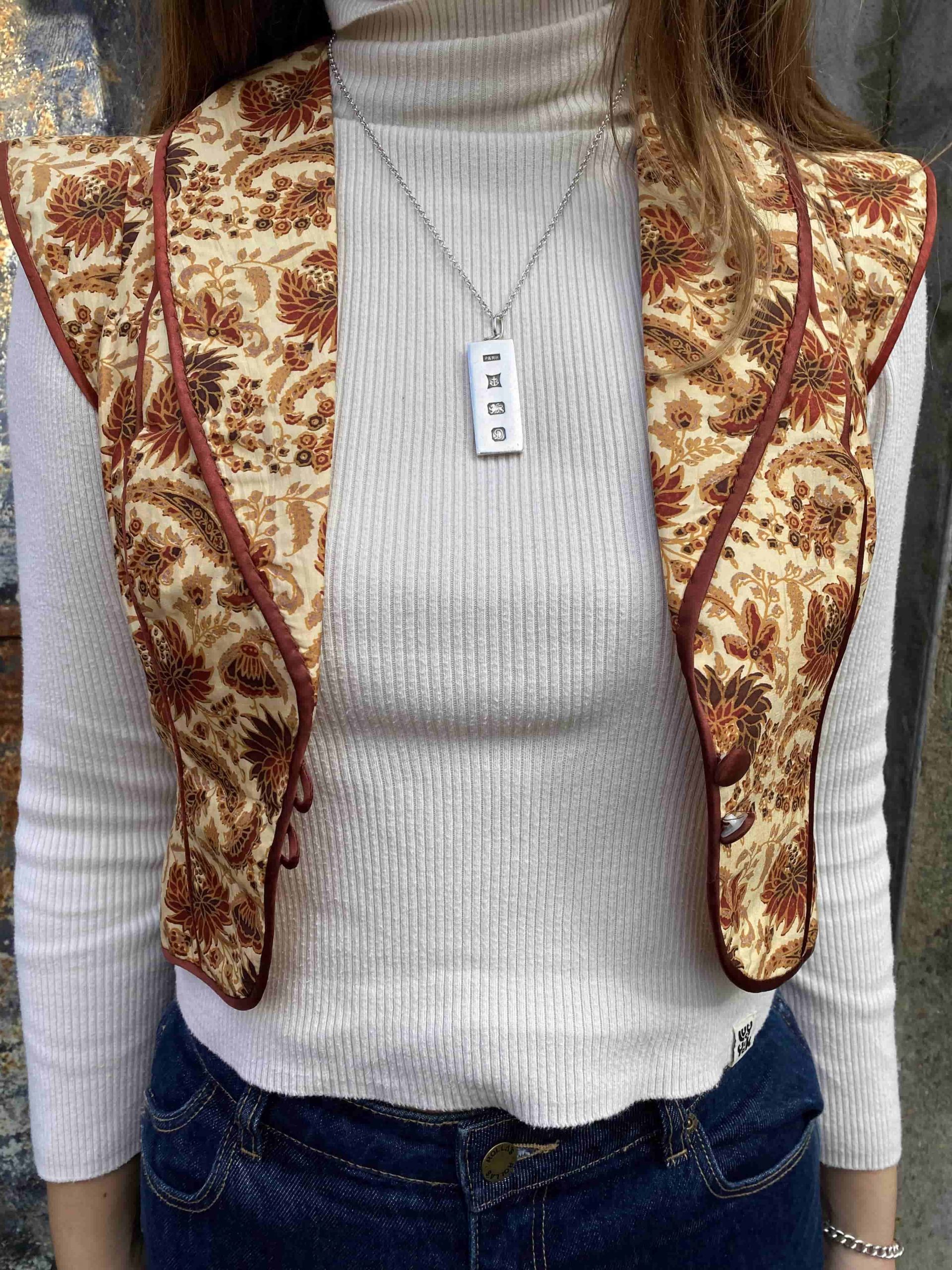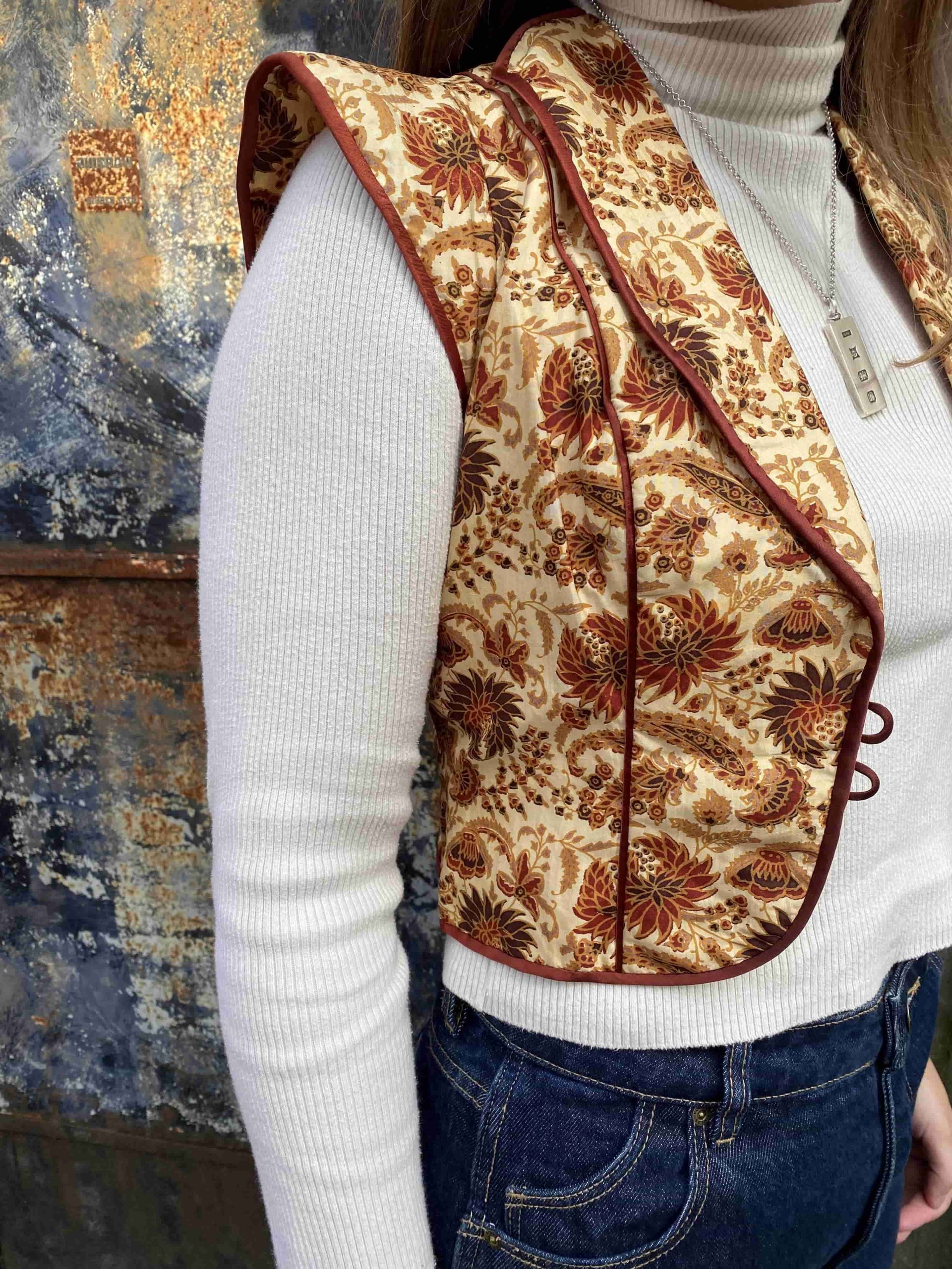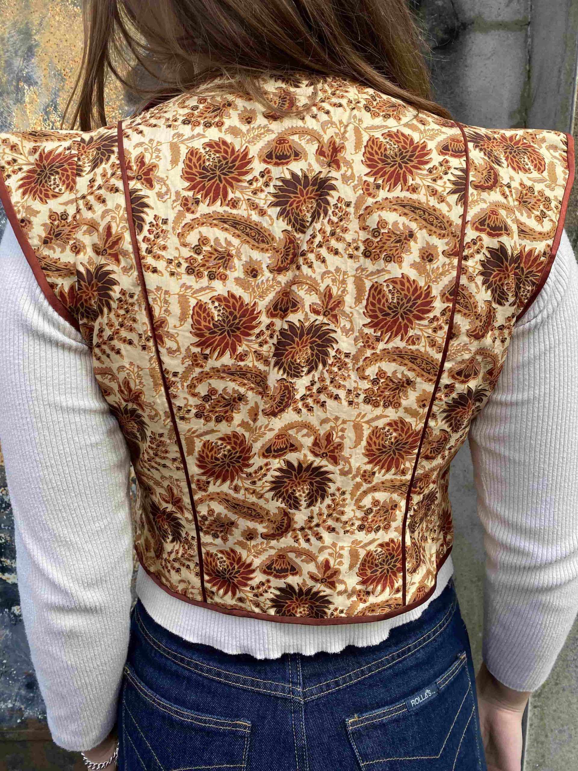 The waistcoat showcases a stunning floral print in shades of burnt orange, brown, and gold, set against a soft cream background. The rich, nature-inspired design is detailed with delicate petals and leaves, bringing a touch of nostalgia and bohemian flair to your outfit. The warm hues make this piece easy to pair with neutral or contrasting tones for versatile styling.