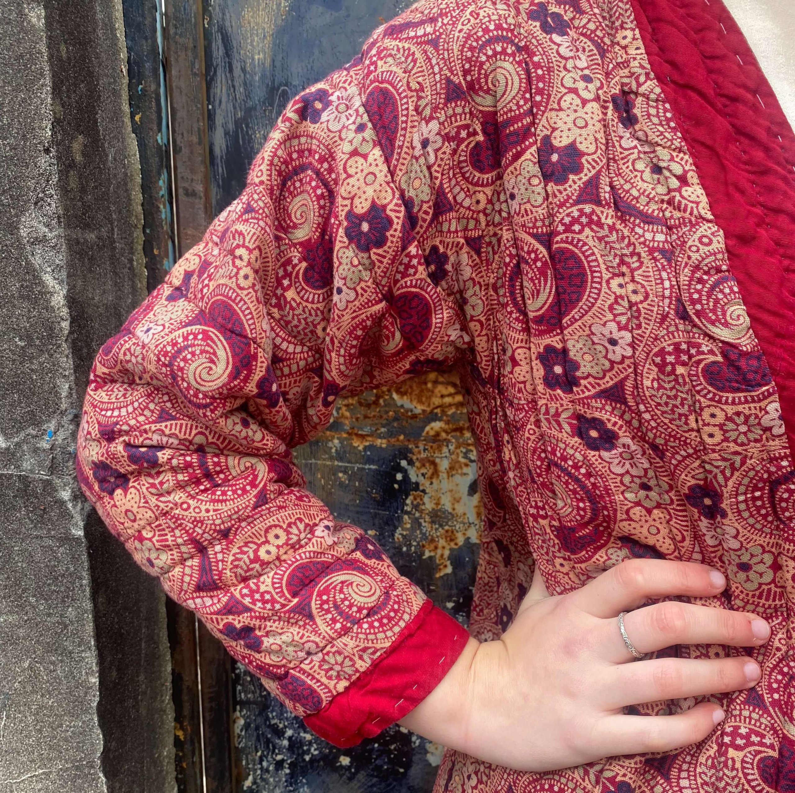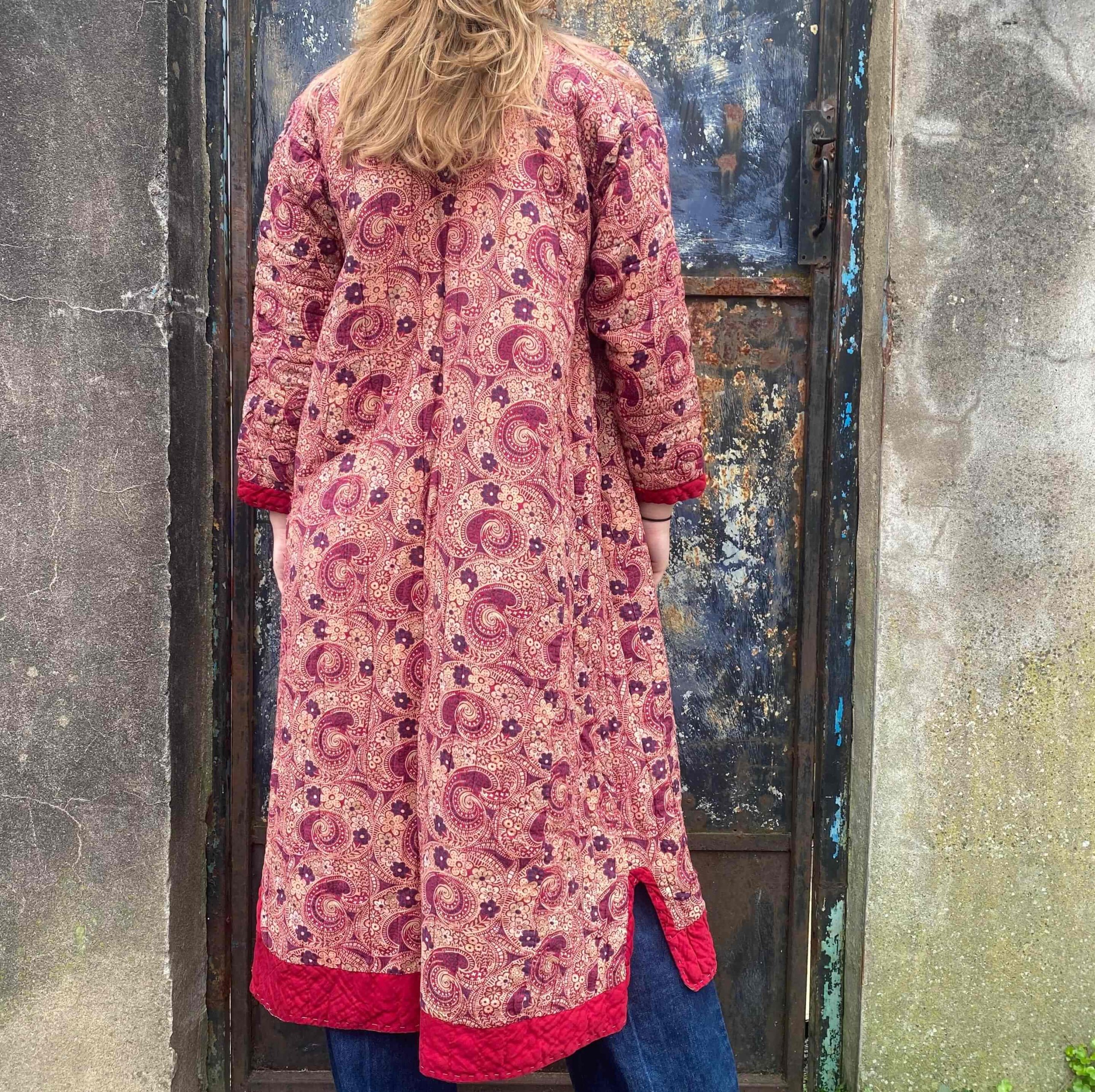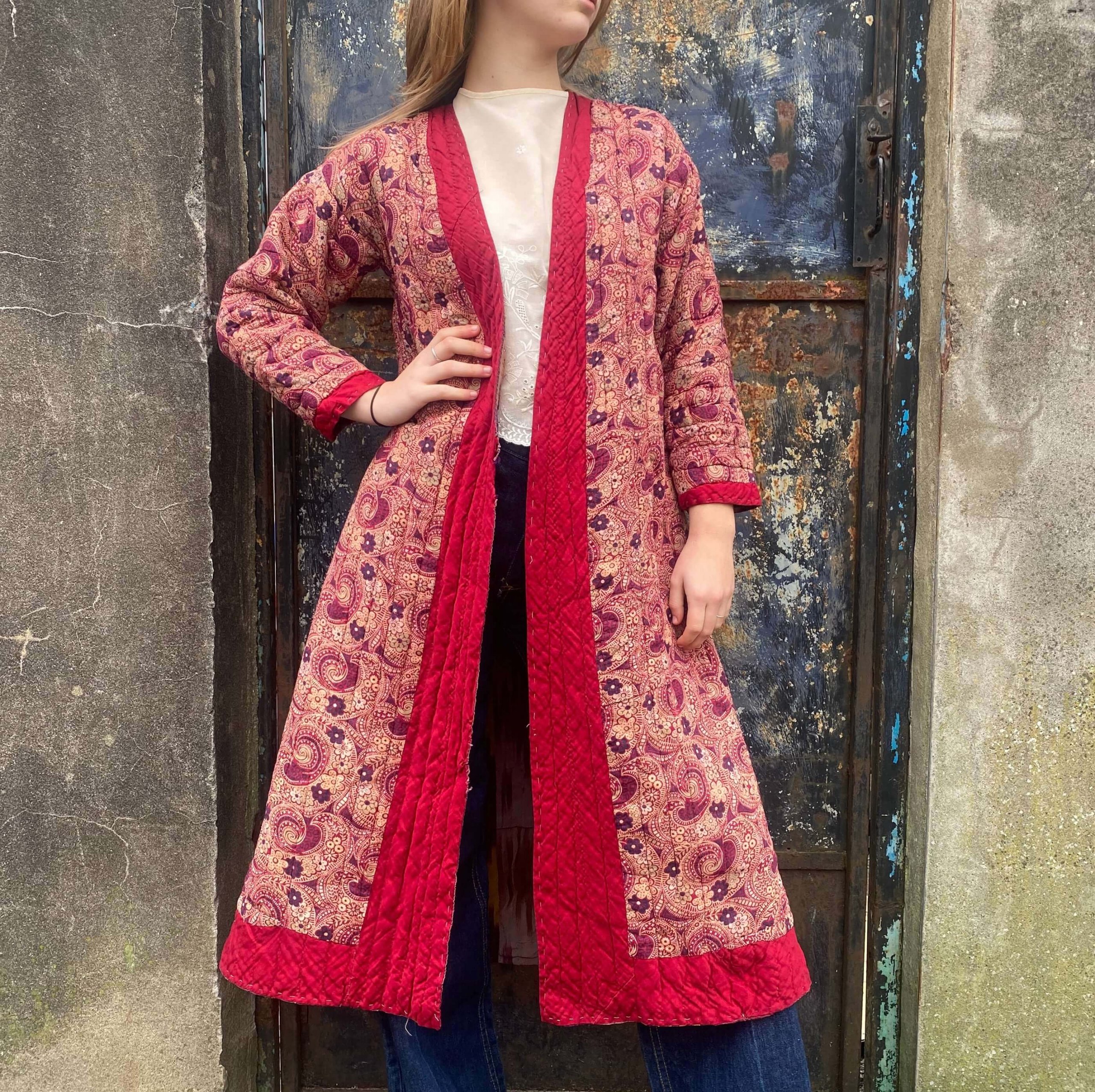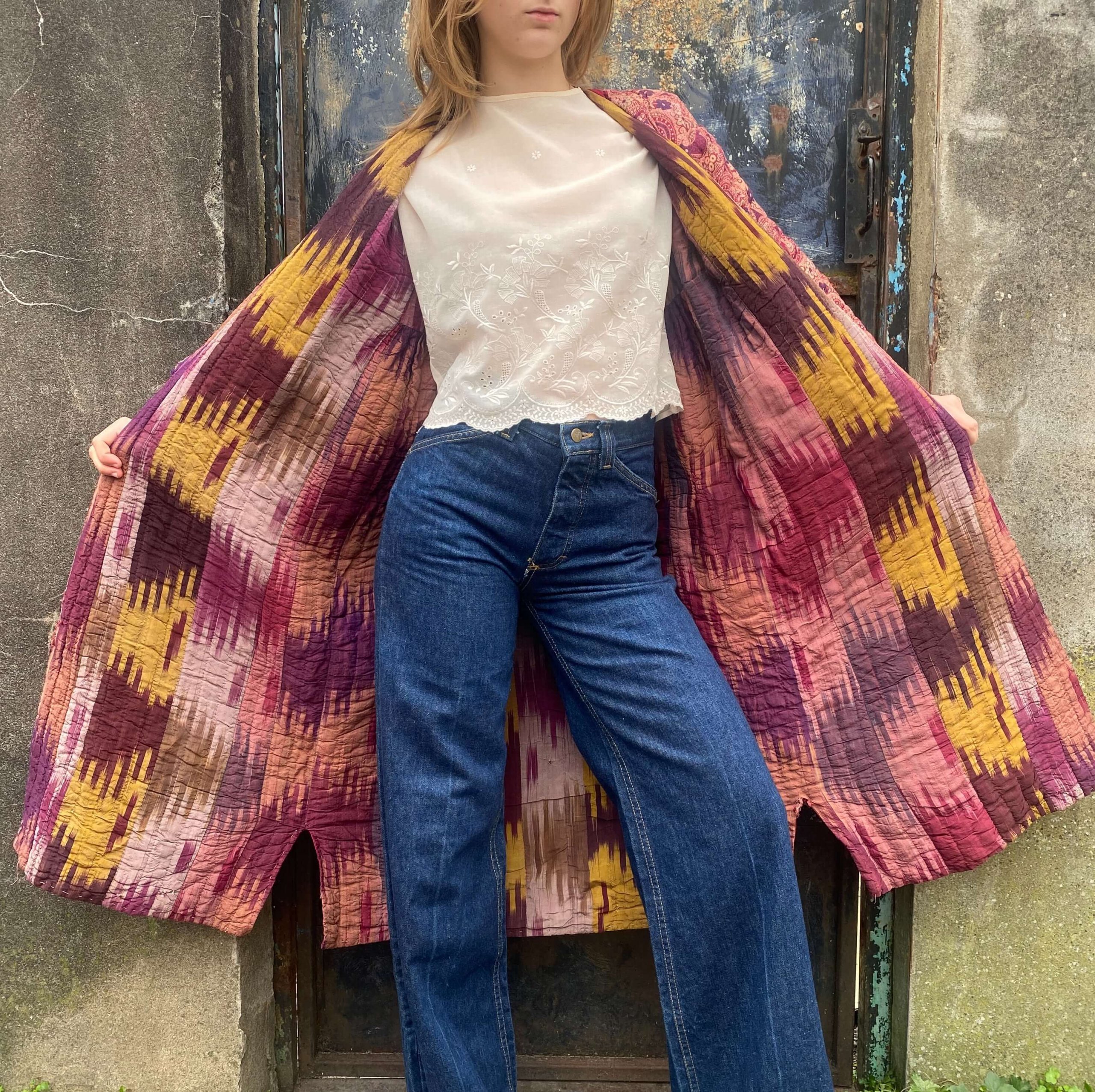 Elevate your wardrobe with this Antique Burgundy Paisley Quilted Uzbek Ikat, a stunning vintage piece that blends traditional Uzbek design with a rich, warm burgundy palette. Fully reversible, this versatile coat adds cultural charm to any outfit, making it ideal for layering over both casual and formal attire.