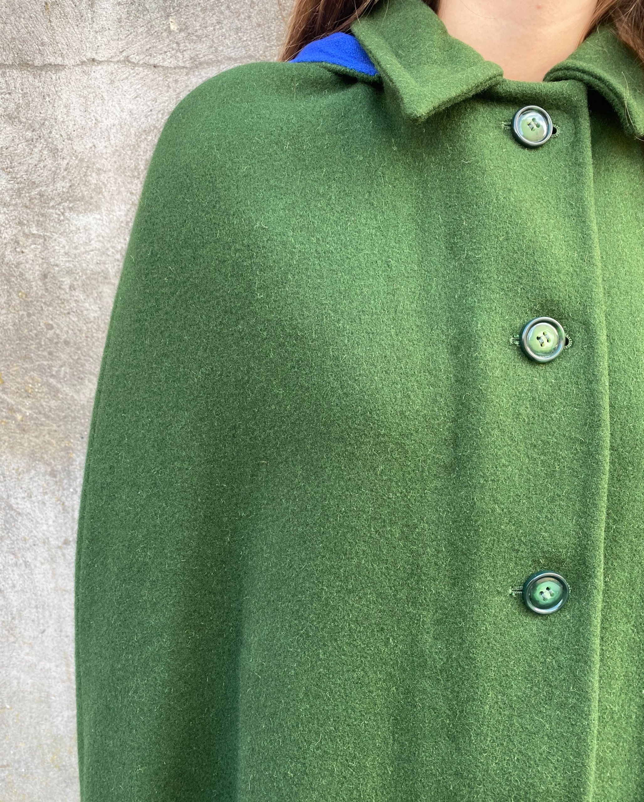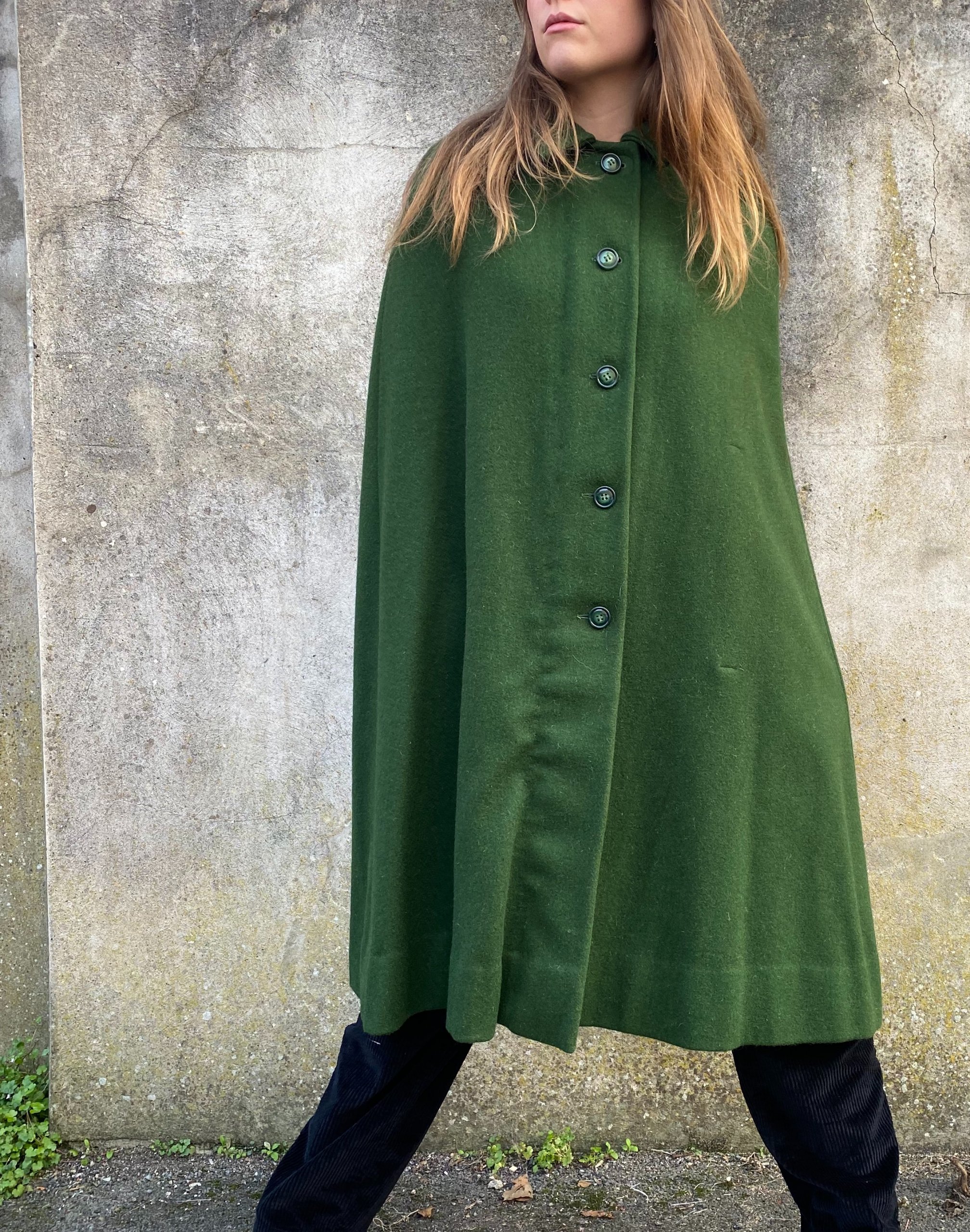 The front of the cape is fastened with a series of matching green buttons that blend seamlessly with the wool fabric. These buttons are carefully chosen to match the cape’s forest green hue, maintaining a sleek and uninterrupted aesthetic. The buttons not only secure the cape comfortably but also serve as a stylish feature, giving the garment a polished and cohesive look that reflects the classic styles of the 1960s and 70s.
