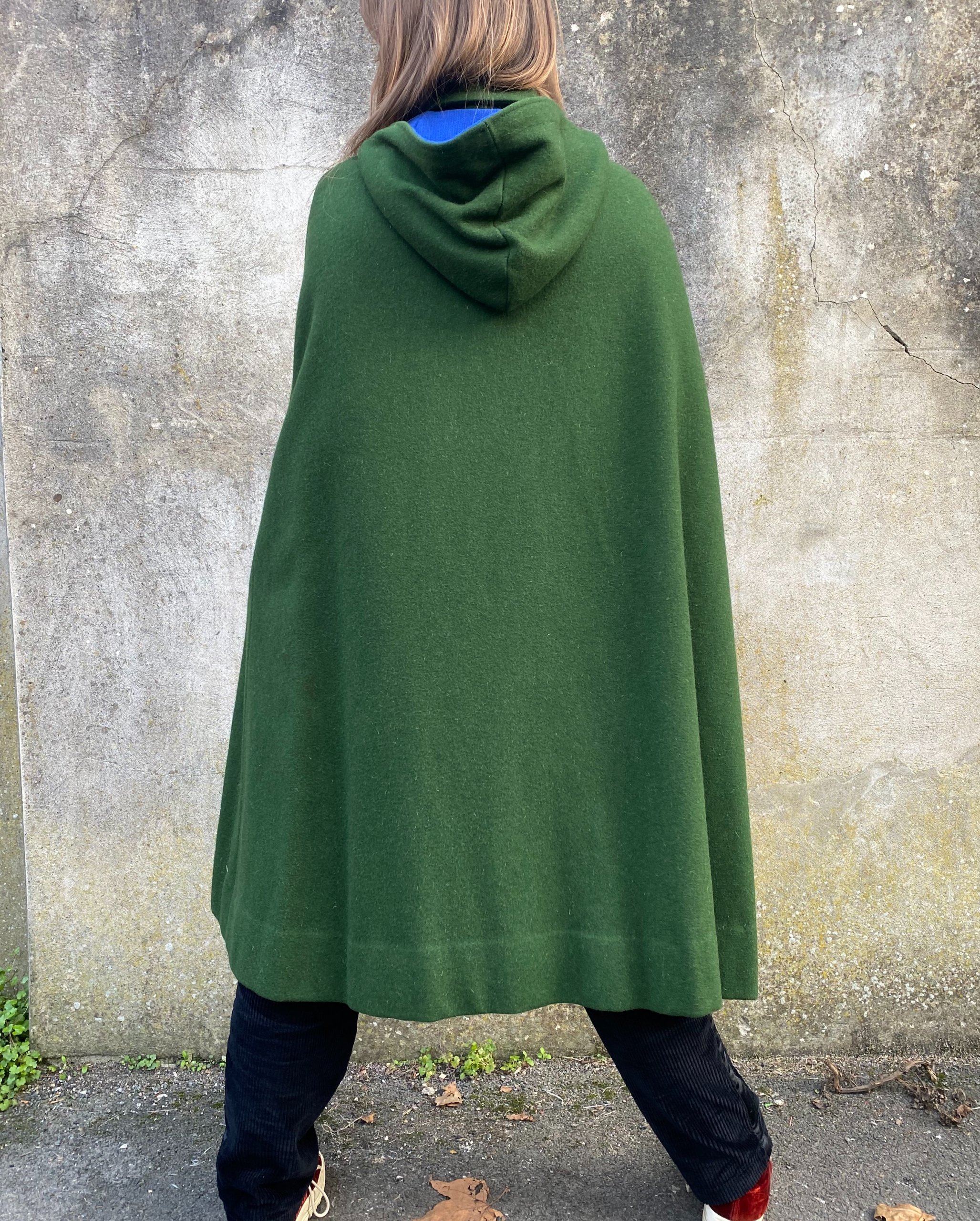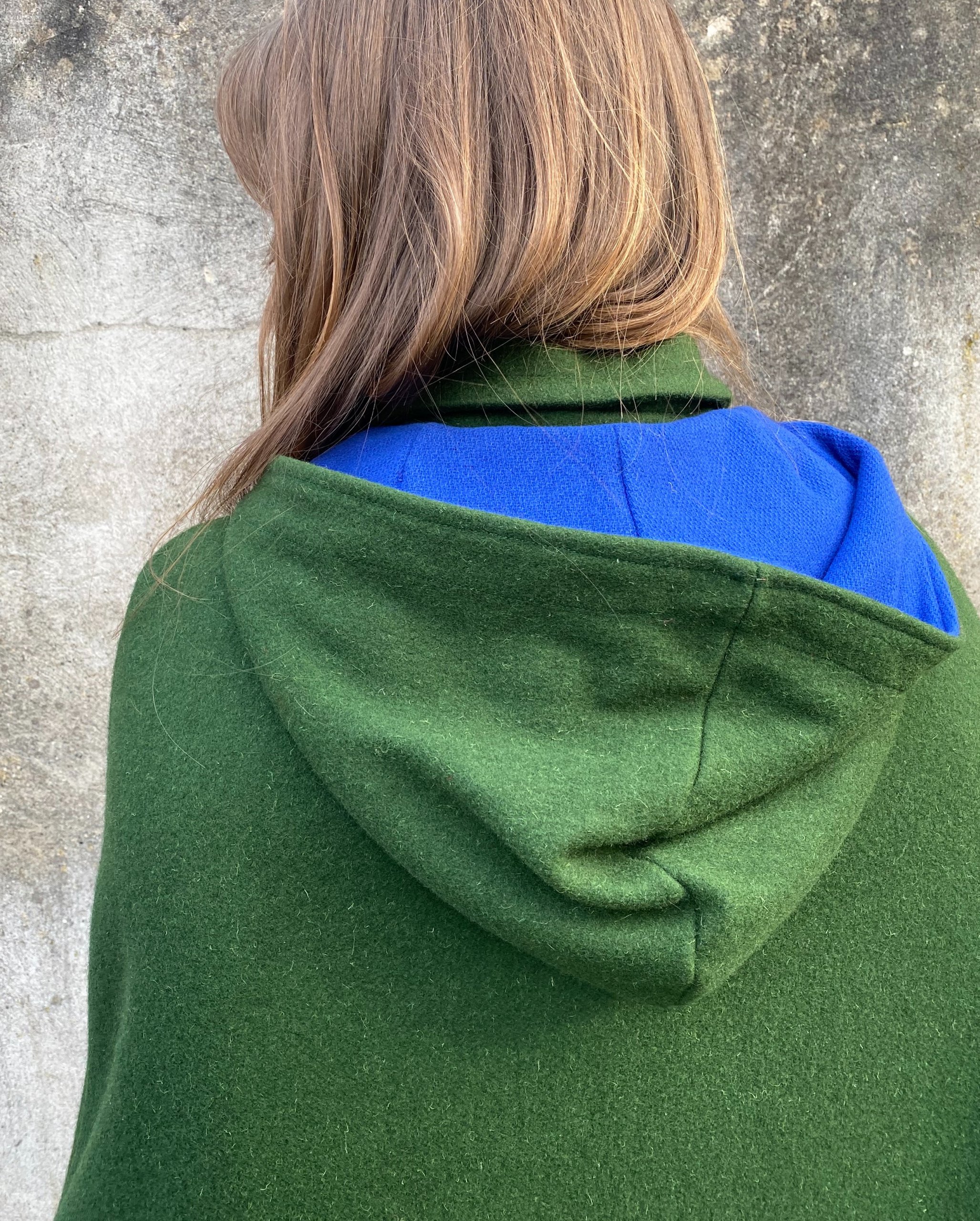 This cape features a generous hood with a contrasting blue inner lining that adds a pop of unexpected colour. The cool-toned blue lining is a stunning complement to the deep forest green, creating a visual contrast that enhances the cape’s design. The hood provides extra warmth for blustery days while giving the cape a playful yet sophisticated flair. It’s a subtle detail that speaks to the quality craftsmanship and attention to detail.