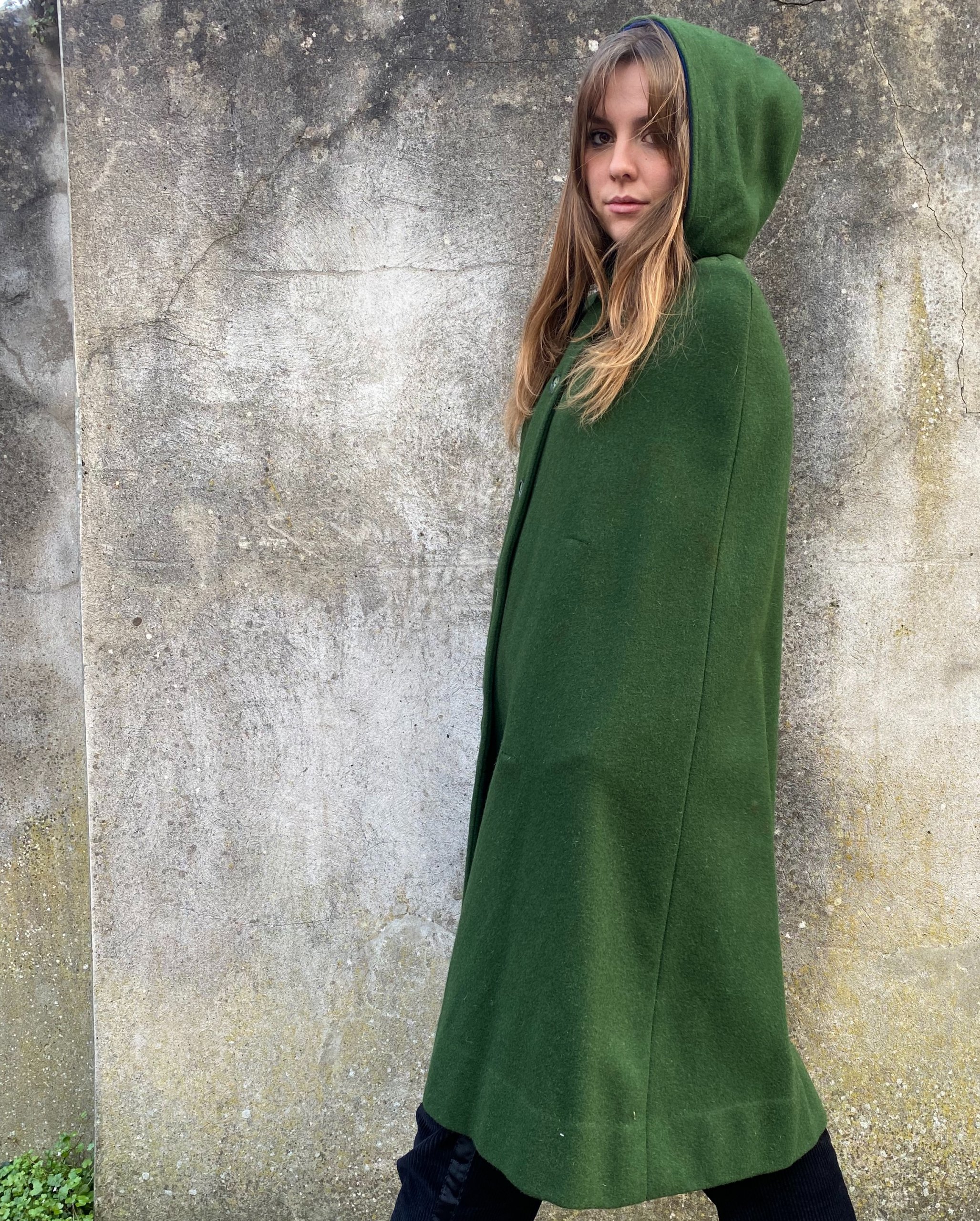 Capture the essence of 1960s and 70s fashion with this beautiful forest green wool cape. This vintage-inspired piece exudes timeless elegance, combining warmth and style with thoughtful design details. The rich forest green colour offers a subtle yet striking presence, making it the perfect addition to any fall or winter wardrobe. The cape’s luxurious wool fabric provides comfort and durability, while its unique touches reflect the carefree yet sophisticated spirit of the era. Whether you’re stepping out in the city or heading for a weekend escape, this cape is a chic and practical choice for cooler weather.