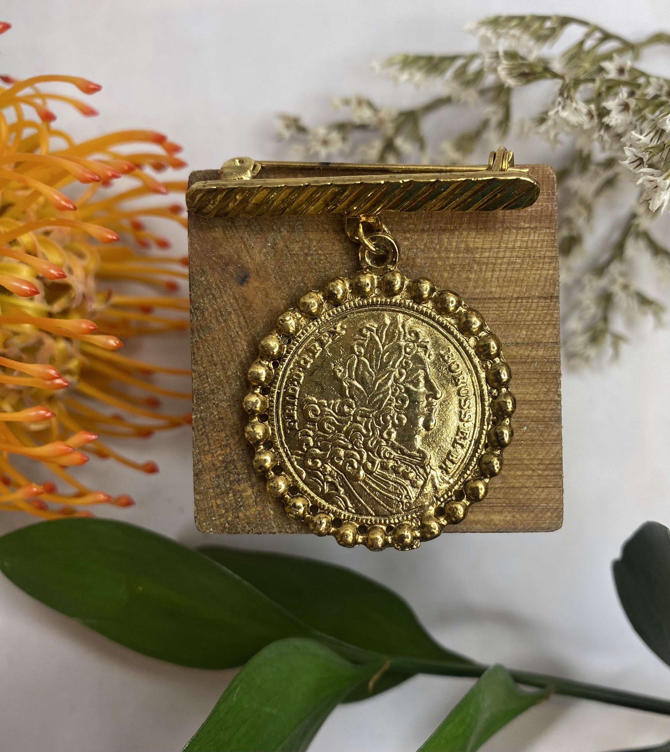Step back in time with this Gold Roman Coin Brooch, a stunning accessory that blends ancient history with modern elegance. Featuring a detailed Roman coin replica framed in a polished gold finish, this brooch evokes the grandeur of antiquity while remaining a sophisticated addition to any wardrobe.