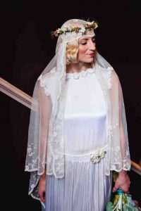 Those that could afford it would have dresses decorated and lined with intricate lace, gold and silver embellishments and some took inspiration from the Art Deco style, creating geometric patterns with beads and pearls  Brides often wore lots of accessories such as delicate cloche hats or glitzy headpieces and incredibly long, light veils made from tulle.