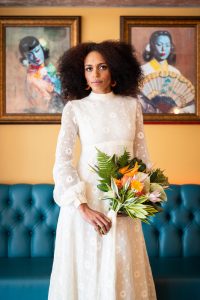 Mod fashion also started seeping into wedding trends and the column dress became popular. This streamlined silhouette paired with empire lines and long sleeves was the complete opposite of the A line, strapless look from the decade before. Delicate daisies featured heavily on dresses, embroidered onto sleeves and the dresses themselves for those looking for something soft and feminine. Others opted for ‘Space Age’ style metal accessories such as headbands and bangles. Veils also started to fall out of fashion with brides letting their beehives be the focus point, or for those who went for a classic pixie cut, a floppy hat.